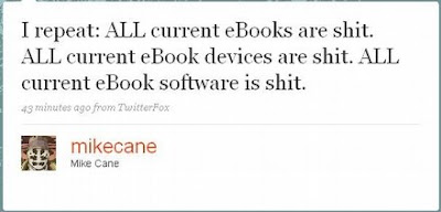 All eBooks -- so-called -- are right now nothing more than a lightly tarted-up text dump into a specific electronic container. They're objects with less capability than print (go on, riffle through those pages with eInk's refresh rate!) and even dumber than print (uh, which page are you actually on?). They are linear, they are stupid. They are the lowest common denominator of what an eBook can be -- and even at that they are simply atrocious.